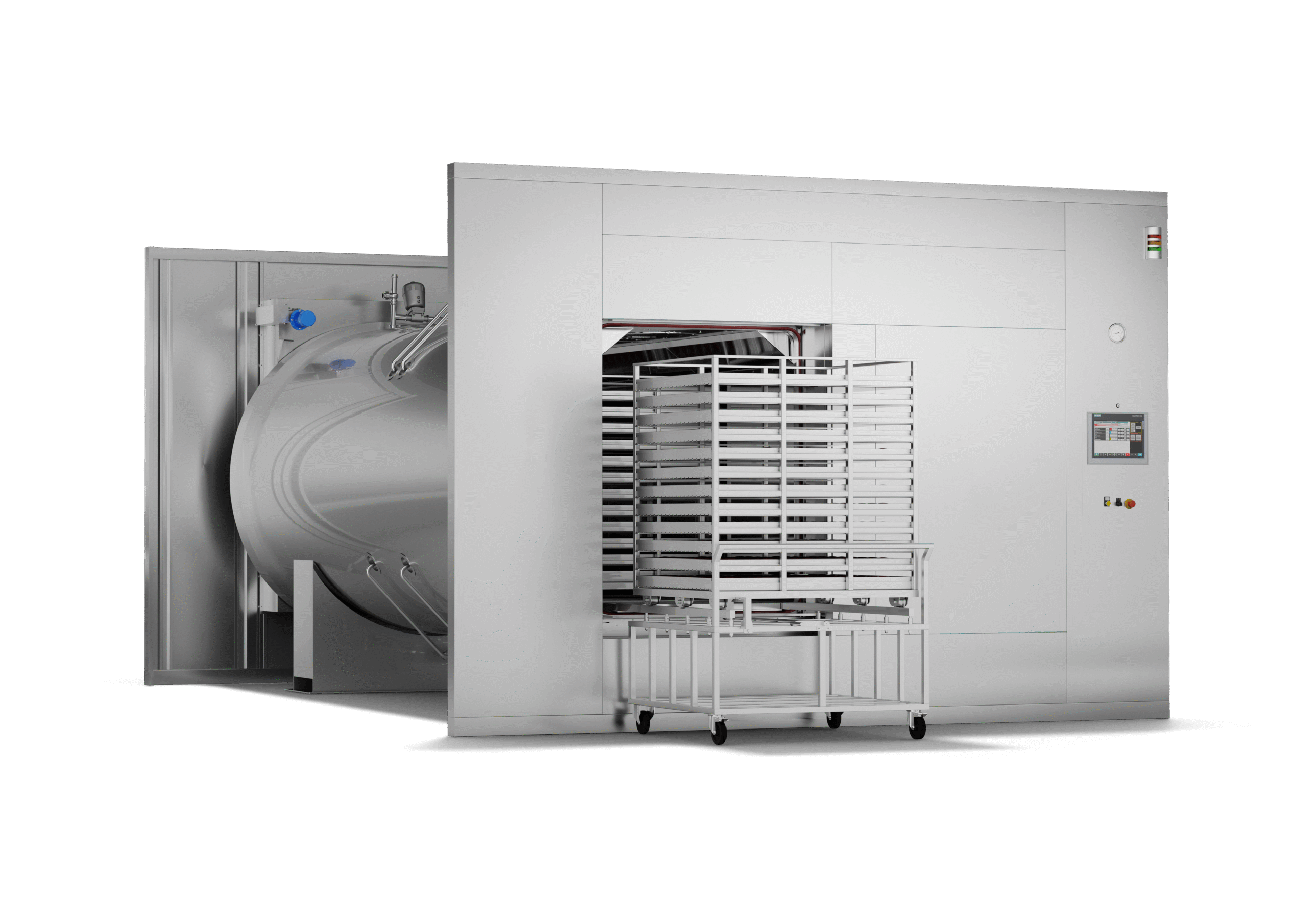 Pure steam is used in the chamber for heating liquids and over-pressure filtered air is injected into chamber to compensate for the rising temperature and pressure inside products. Internal fans ensure a uniform temperature distribution, between 110°C to 135°C, and to avoid cold spots across the chamber. Rapid heating and cooling are standard phases. Products are completely dry at the end of the cycle.